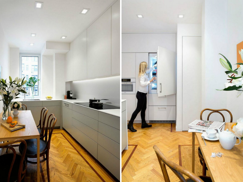 - một tủ lạnh đầy đủ có thể được đặt ở hành lang. Điều này sẽ giải phóng không gian đáng kể trong nhà bếp, nhưng bạn sẽ phải liên tục đi ra hành lang để mua hàng tạp hóa;