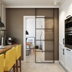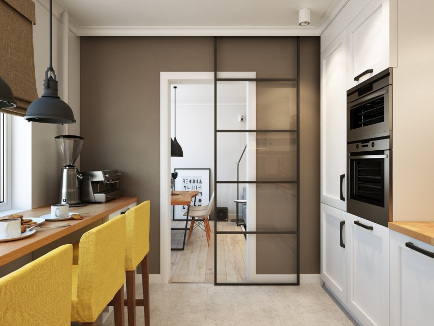 - tốt nhất là lắp cửa trượt vào nhà bếp ở Khrushchev. Ý tưởng về một tùy chọn cửa như vậy có thể tốn kém hơn một chút, nhưng trong trường hợp này, bạn có thể tiết kiệm đáng kể không gian hữu ích.