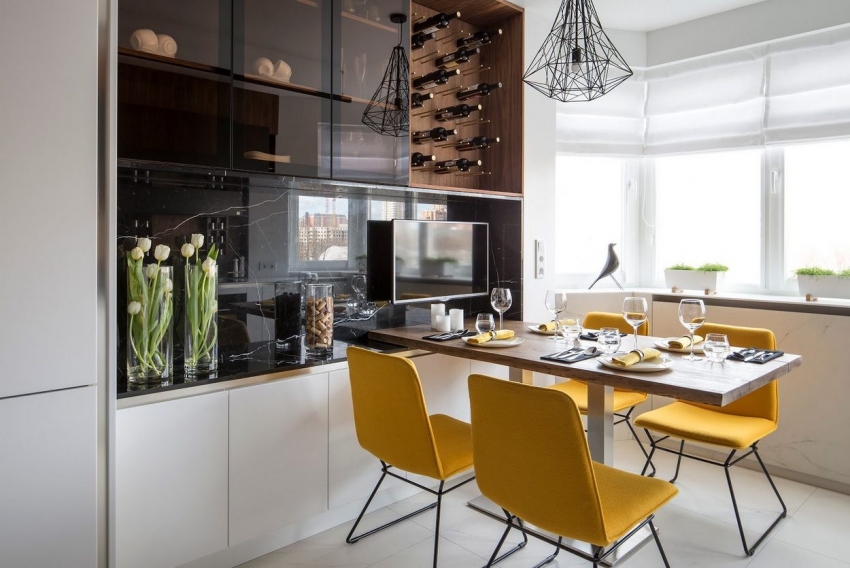 Khi nào kết hợp nhà bếp với phòng khách, bạn có thể sử dụng các tùy chọn thú vị để chiếu sáng tại chỗ, từ đó làm nổi bật khu vực ăn uống hoặc nơi nghỉ ngơi