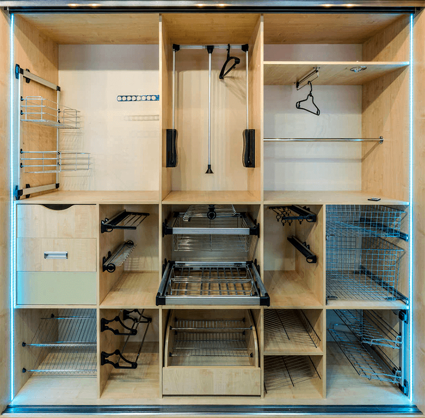Các yếu tố lấp đầy bên trong và các phụ kiện kéo ra cho tủ quần áo trượt
