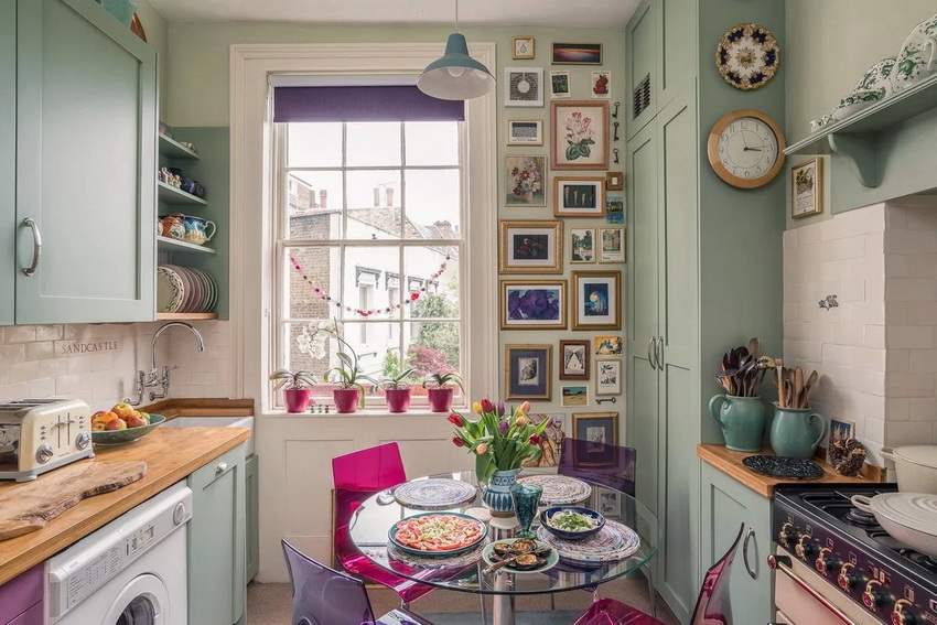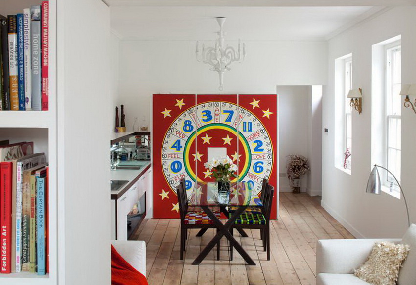 Nghệ thuật đại chúng là một hướng đi tươi sáng và tiến bộ, do đó, một sản phẩm đặc biệt và nhỏ như một chiếc bàn với mặt kính cho nhà bếp là tối ưu cho nội thất này. Màu vàng, hồng, xanh, đỏ và các màu sáng khác của mặt bàn hoàn toàn phù hợp với phong cách này.