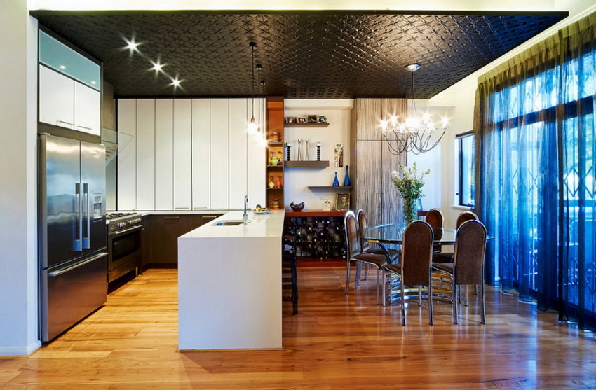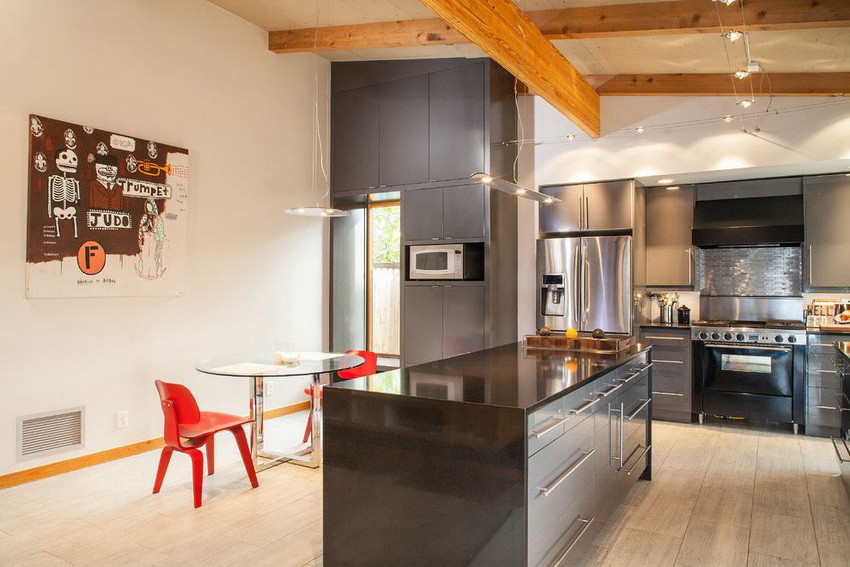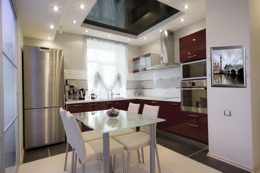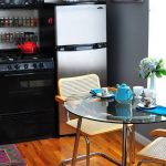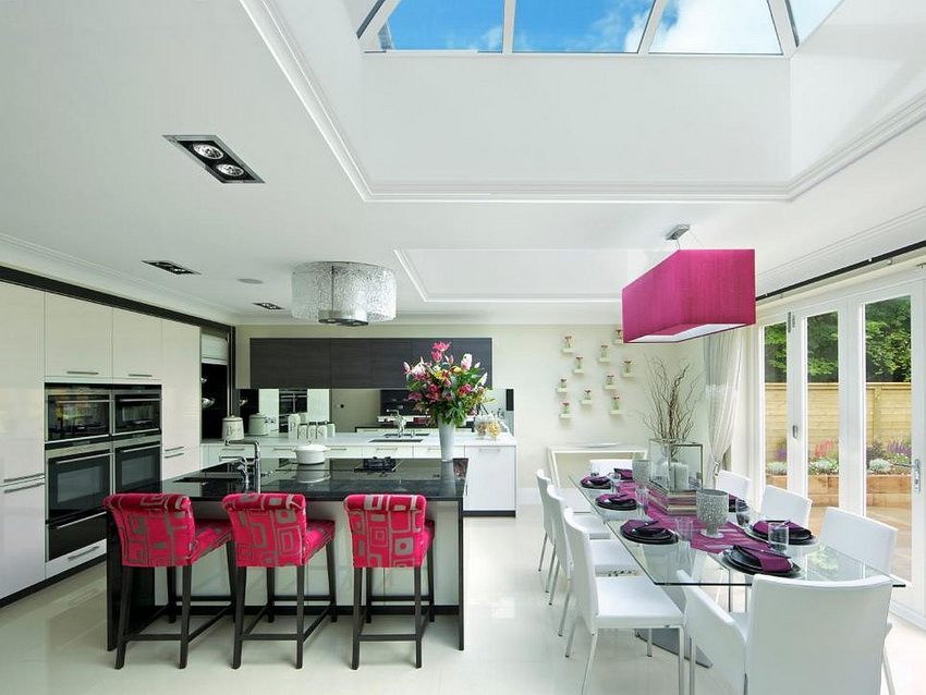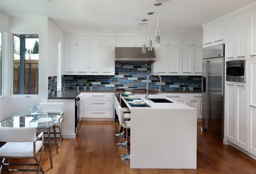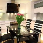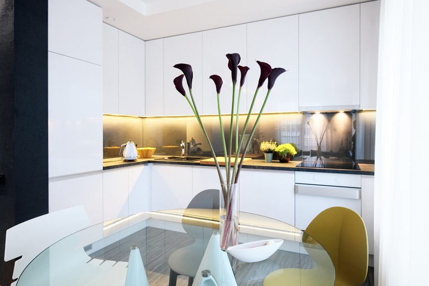 Bàn kính trong suốt hoặc trắng trong nhà bếp được coi là một lựa chọn phổ biến. Cấu trúc trong suốt và mờ của các sắc thái bão hòa: cam, vàng, đỏ, xanh lá cây, xanh ngọc trông rất ngoạn mục và tươi sáng. Mặt bàn màu đen bóng tạo vẻ sang trọng cho căn bếp.