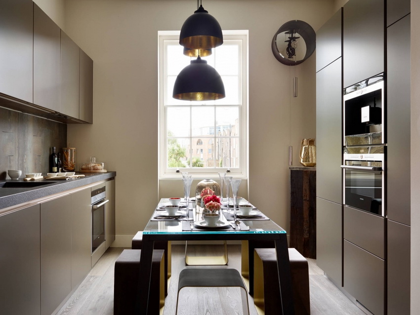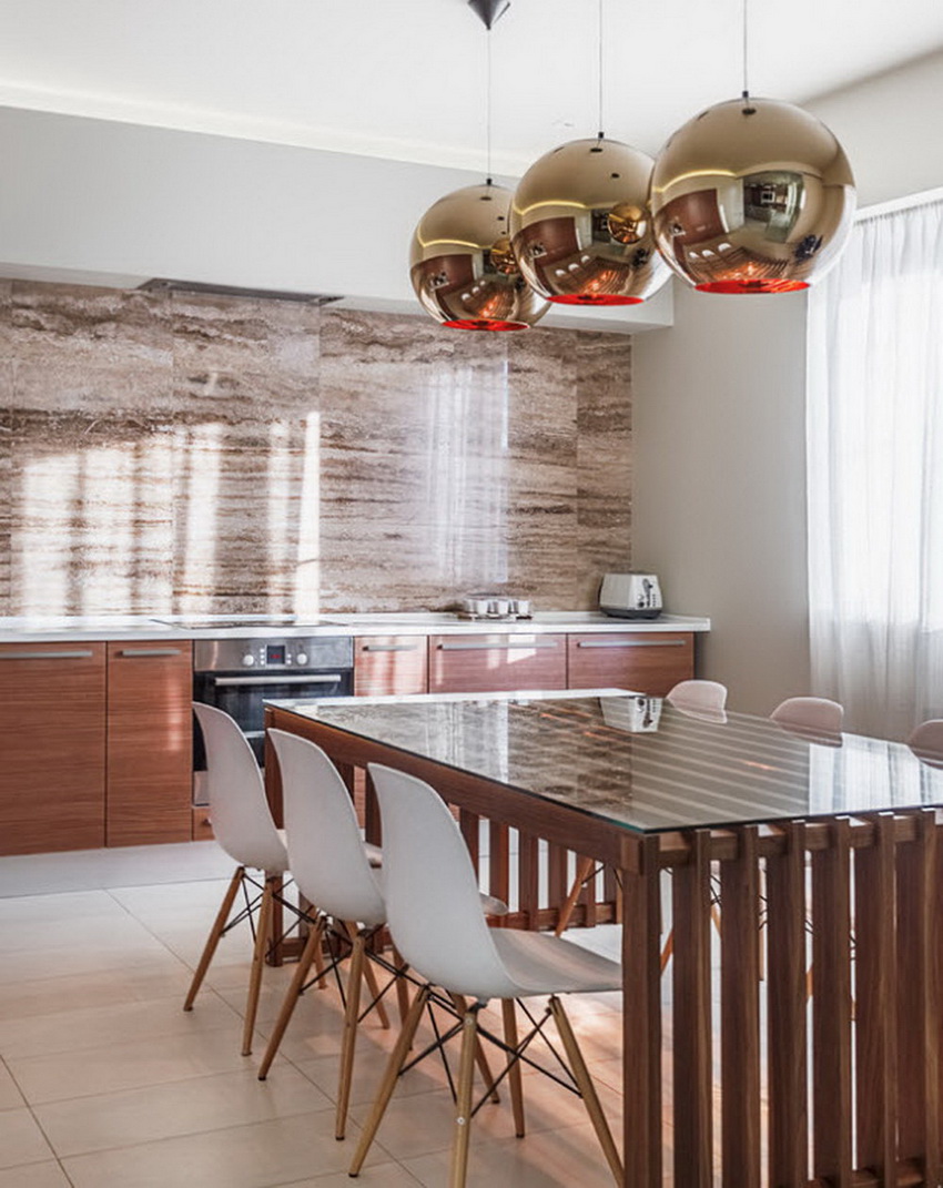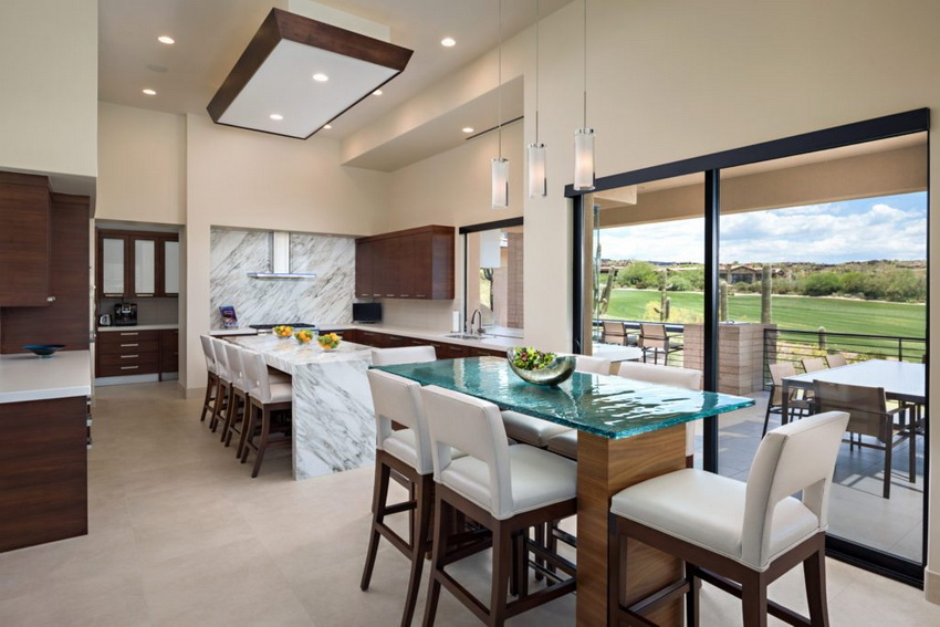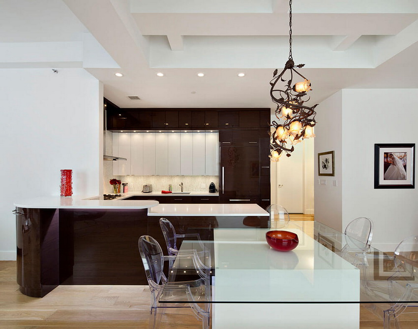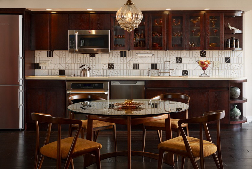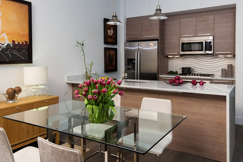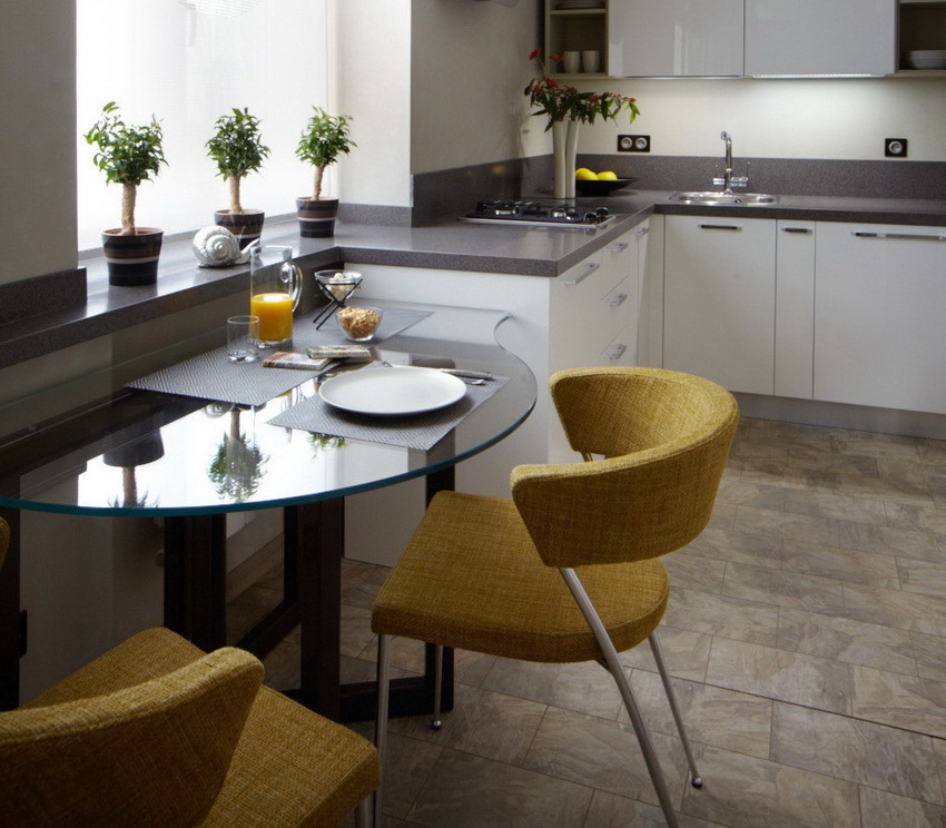 Những chiếc bàn kính kiểu cách rất lý tưởng cho những căn bếp hiện đại, tiện nghi. Họ có thể nhấn mạnh tính độc đáo và duy nhất của thiết kế thời trang.