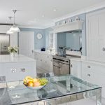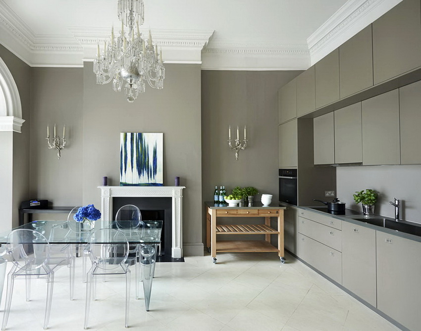 Mặc dù bàn bếp có mặt kính không đáp ứng được những ý tưởng cổ điển của món đồ nội thất này, nhưng những thiết kế như vậy, được làm theo phong cách thiết kế này, phù hợp hài hòa với phòng khách và nhà bếp. Bàn màu đen, trắng, xám, xanh, đỏ và các loại bàn đơn sắc khác trông tuyệt vời theo phong cách cổ điển và tạo thêm nét đặc biệt cho không gian của căn phòng.