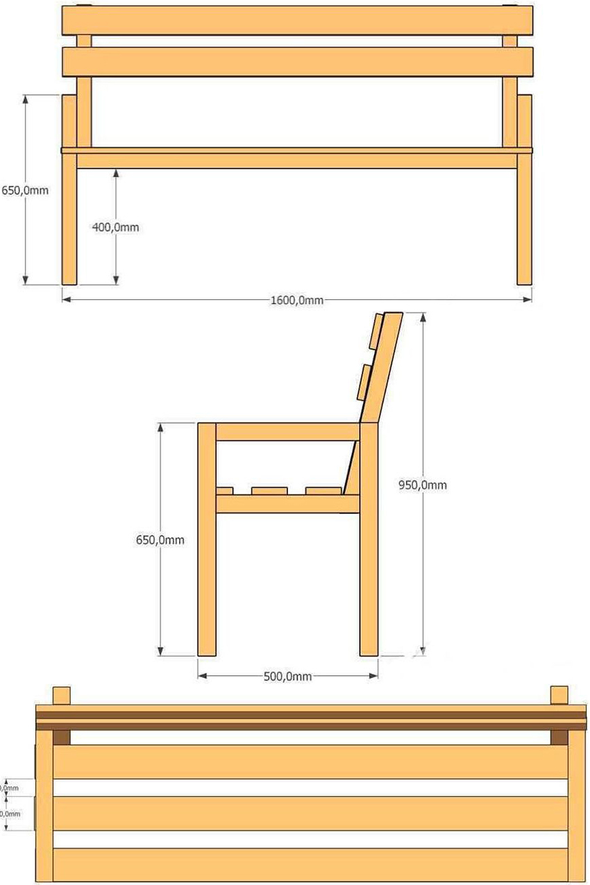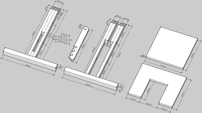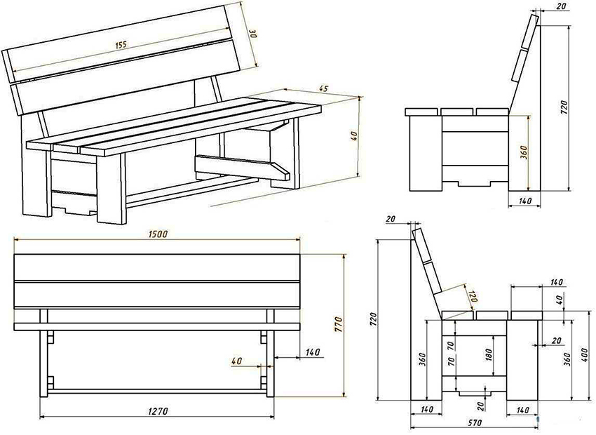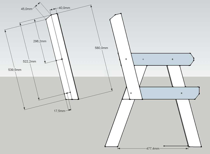 - Các tấm ván, khối cố định, tay vịn, thanh thẳng đứng và chân trước phải được cắt ở góc 90 °. Các chùm được đặt ở góc 45 °. Chân sau - ở góc 11 °. Trên một mặt của tựa lưng, cần cắt 200 mm ở góc 5 °.