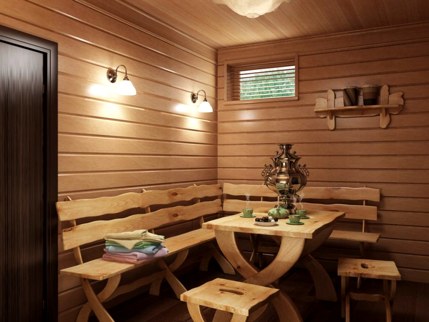 Tình trạng cơ thể sau phòng xông hơi ướt và đồ nội thất tiện nghi mang đến cho một người cơ hội thư giãn.Việc thực hiện mong muốn này phần lớn phụ thuộc vào nội thất của căn phòng. Nhà tắm - một tòa nhà bổ sung trên trang web, tương ứng, có kích thước nhỏ. Và ngay cả căn phòng lớn nhất trong nhà tắm (phòng thư giãn) thường chỉ có diện tích từ 16-20 m².
