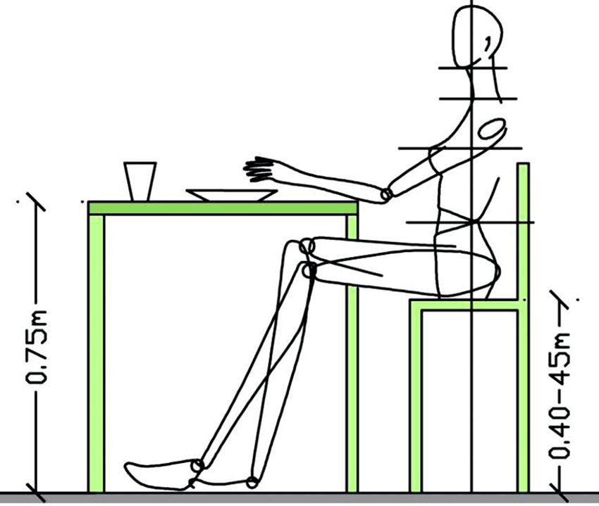 Chiều cao của nội thất phòng bếp là một thông số quan trọng khi lựa chọn một sản phẩm, nó quyết định sự thoải mái khi ngồi sau đó và sự thuận tiện trong khi ăn. Giá trị tiêu chuẩn của chỉ số này được quy định bởi một văn bản pháp quy, chỉ ra rằng khoảng cách từ mặt sàn đến mặt bàn phải nằm trong khoảng 0,71-0,9 cm. Giá trị trung bình của chiều cao tiêu chuẩn của bàn bếp là 0,75 cm. Đây là giới hạn bắt buộc tại đó đầu gối của người đó sẽ không tựa vào đáy bàn.