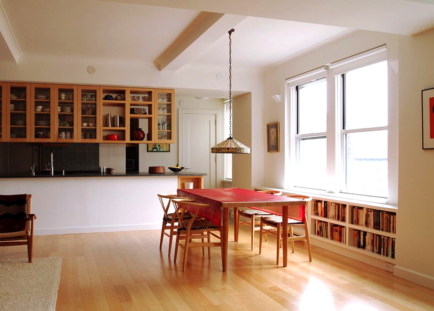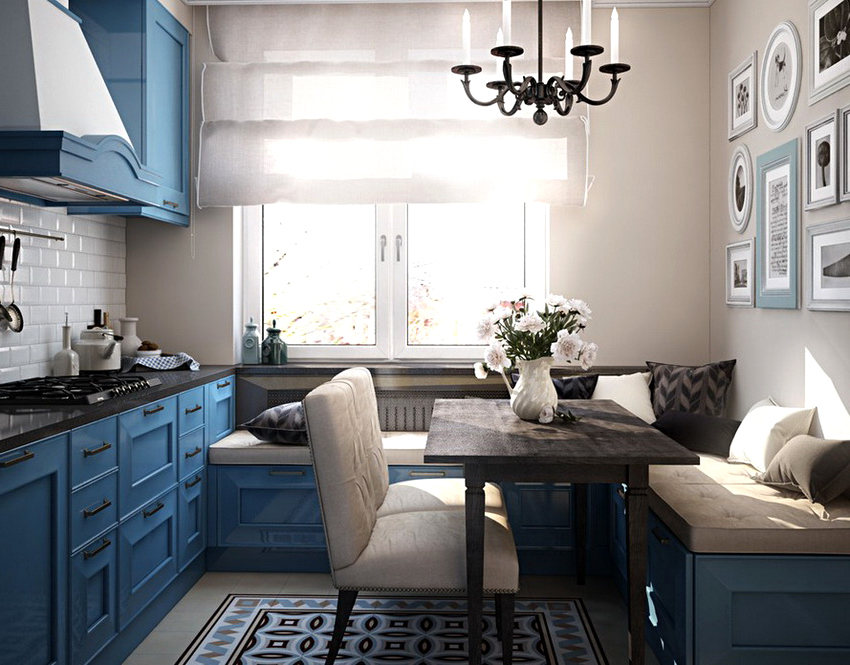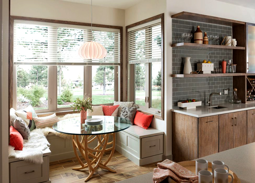Trong một căn bếp nhỏ, bàn ăn có thể được làm từ bệ cửa sổ bằng cách kéo dài nó với một mặt bàn mở rộng có chiều rộng cần thiết. Ở đây được phép tổ chức khu vực làm việc và không gian lưu trữ đồ dùng nhà bếp.