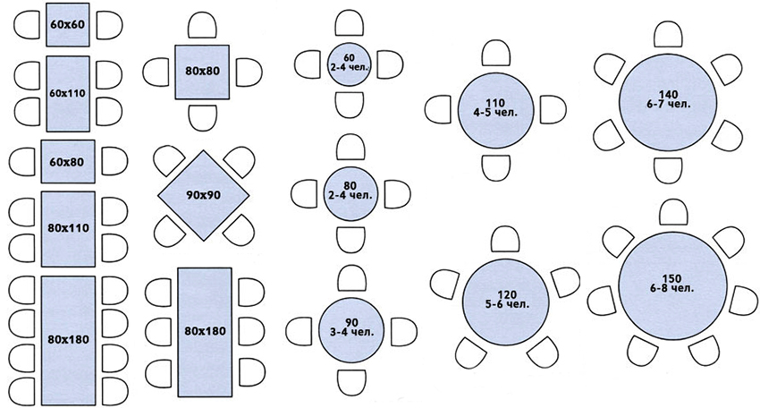 Kích thước của ghế và bàn bếp phụ thuộc trực tiếp vào hình dạng của sản phẩm. Cấu hình hình chữ nhật, hình vuông, hình bầu dục và hình tròn được coi là tiêu chuẩn.