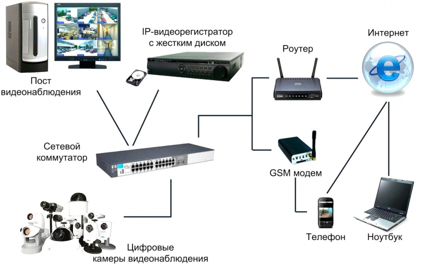 Thành phần chính của toàn bộ hệ thống giám sát là một đầu ghi hình, được trang bị một đĩa cứng, nơi thông tin nhận được từ camera được ghi lại. Tất cả máy ảnh, micrô và cảm biến đều được kết nối với nó. Việc ghi hình có thể được thực hiện ở ba chế độ: suốt ngày đêm, vào một khoảng thời gian nhất định và trong khi nhận lệnh từ camera hoặc cảm biến chuyển động. Để điều khiển DVR từ xa, nó phải được kết nối với Internet.