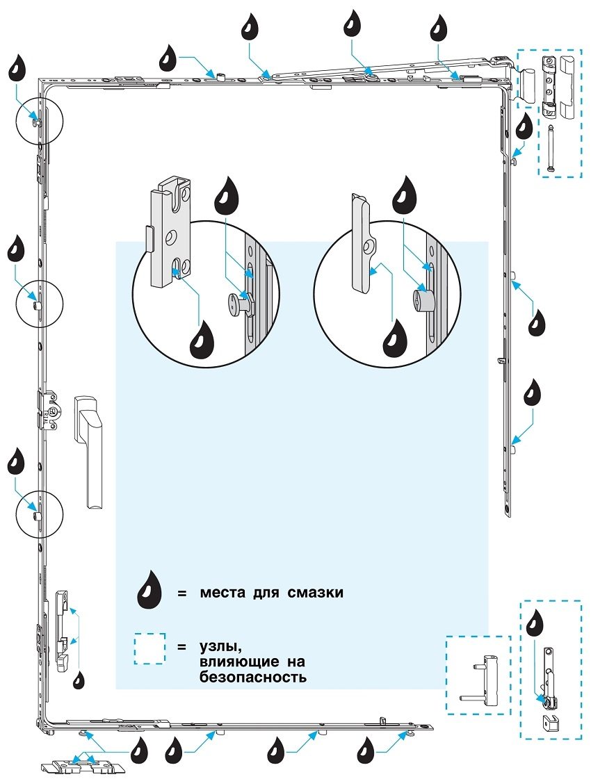 Để làm sạch và bôi trơn tay cầm của tấm chắn, nó được tháo ra, làm sạch bụi và các chất bẩn khác, bôi trơn bằng hợp chất ngâm tẩm WD-40 và được gắn vào vị trí. Để thuận tiện cho việc phủ mỡ các phụ kiện, hãy sử dụng vòi phun có ống. Nên sử dụng chất ngâm tẩm mỗi khi điều chỉnh cửa sổ.