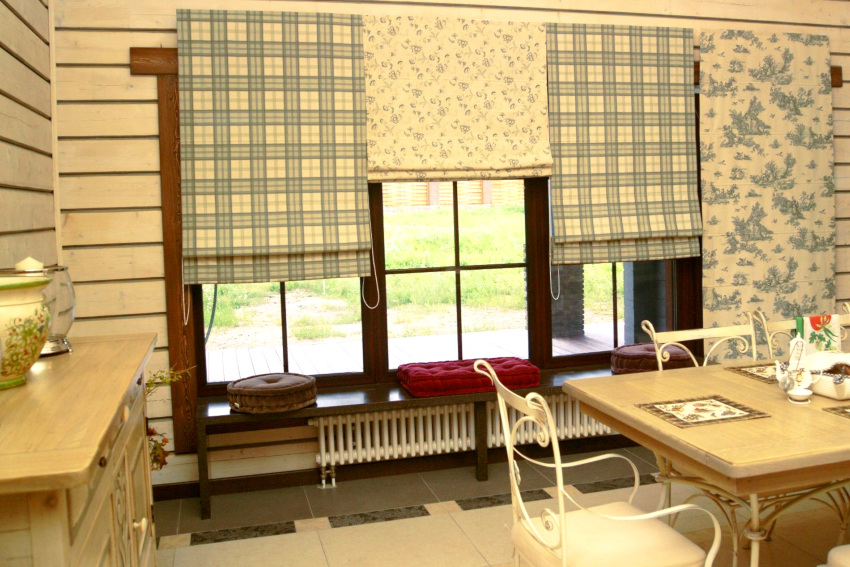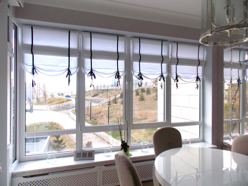 Nó đặc biệt thuận tiện để sử dụng tùy chọn này trong nhà bếp nhỏ, nơi ngưỡng cửa sổ là phần tiếp nối của mặt bàn hoặc một khu vực ăn uống nhỏ được tổ chức trên đó. Việc buộc chặt trong mặt phẳng của cửa sổ rất thuận tiện để sử dụng để tạo ra các kết hợp phức tạp, trong đó, ngoài các sắc thái La Mã, rèm cửa, lambrequins hoặc rèm cửa được sử dụng.