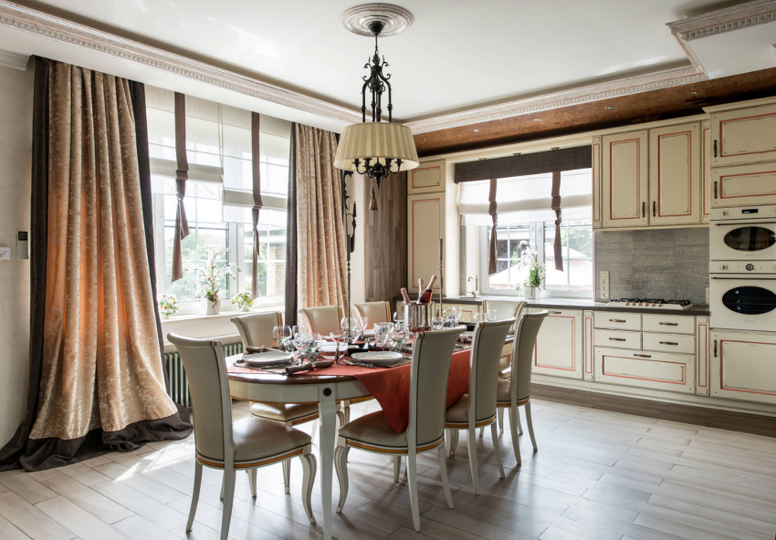 - Nội thất nhà bếp cổ điển được trang trí bằng những tấm rèm dày làm từ lụa, sa tanh hoặc jacquard. Nếu diện tích căn phòng cho phép thì bạn có thể thêm tua rua, tua rua cho các sản phẩm.