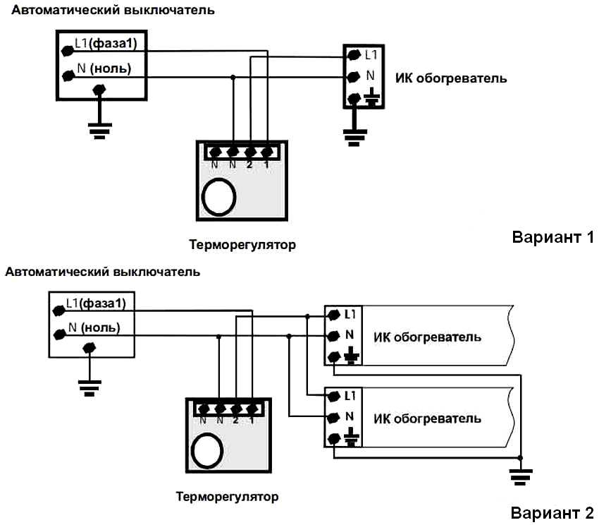 Cách thứ hai, phức tạp hơn một chút, kết nối lò sưởi hồng ngoại qua bộ điều nhiệt là sử dụng kết nối song song. Do đó, có thể kết nối hai thiết bị sưởi với một bộ điều nhiệt cùng một lúc. Một cặp dây từ máy được nối với một bộ điều nhiệt, từ đó, lần lượt, dây được thực hiện đến hai bộ sưởi khác nhau.