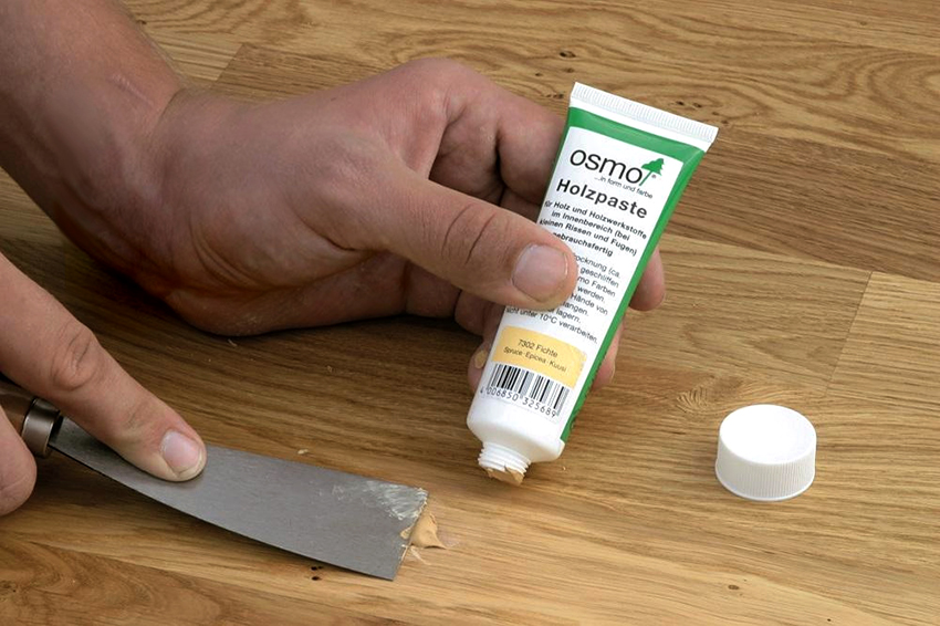 Thông tin hữu ích! Tên thứ hai của bột bả sàn gỗ là bột nhão phục hồi. Nếu bạn không thể tìm thấy tùy chọn mong muốn trên các kệ hàng, bạn có thể thử tự làm miếng dán.