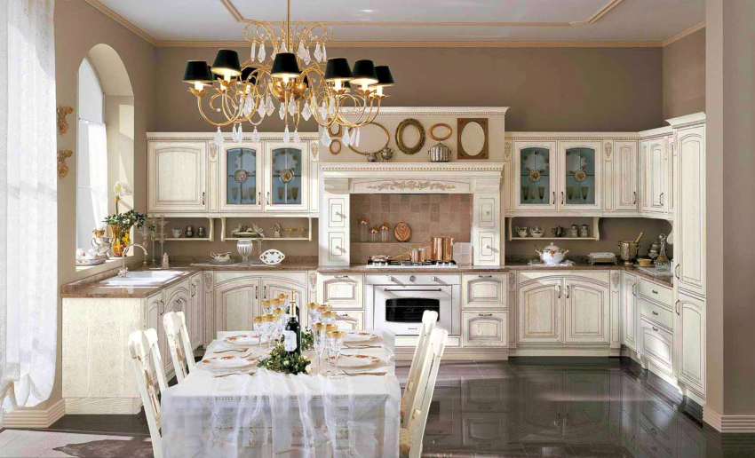 Khi trang trí nội thất, các chi tiết chính có thể được điều chỉnh cho phù hợp với thời hiện đại. Ví dụ, thay vì sử dụng các tấm đá cẩm thạch làm sàn, nên ưu tiên các vật liệu quen thuộc và hợp túi tiền hơn. Trong nội thất nhà bếp hiện đại, bạn nên sử dụng sàn gỗ bắt chước laminate. Tuy nhiên, tốt hơn cho mục đích này là sử dụng gạch men có khả năng chống hư hại cao hơn, trong số đó bạn luôn có thể chọn vật liệu có kết cấu, họa tiết và hoa văn theo yêu cầu, kể cả đá cẩm thạch.