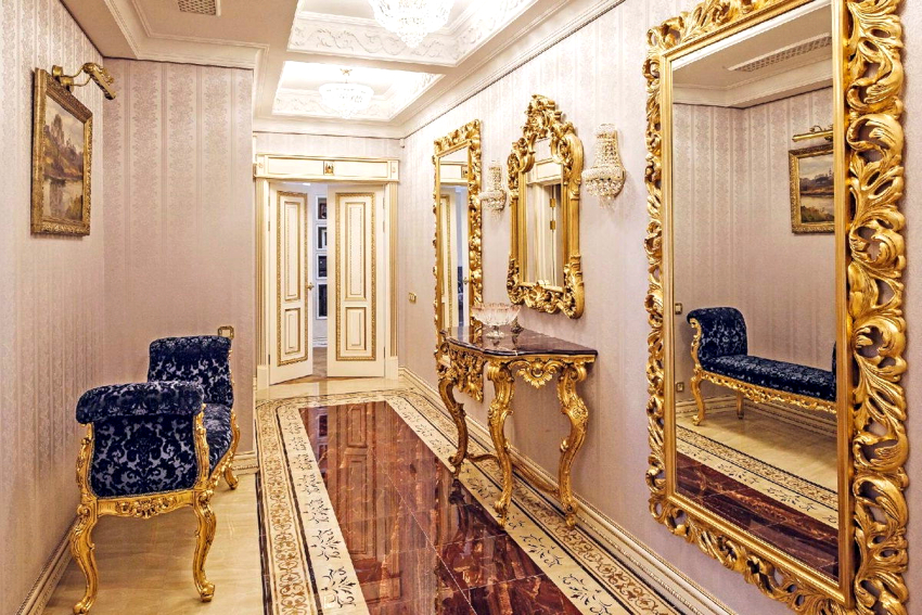 Bất kỳ phòng nào, ngay cả hành lang, theo phong cách Baroque nên trông rất hoành tráng và hoành tráng. Điều này sẽ không chỉ giúp hoàn thiện chính xác mà còn là lựa chọn có thẩm quyền về đồ nội thất, nên được trang trí với nhiều kiểu trang trí phong phú, khác biệt về hình dạng kỳ lạ và đường cong.