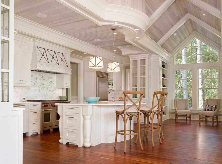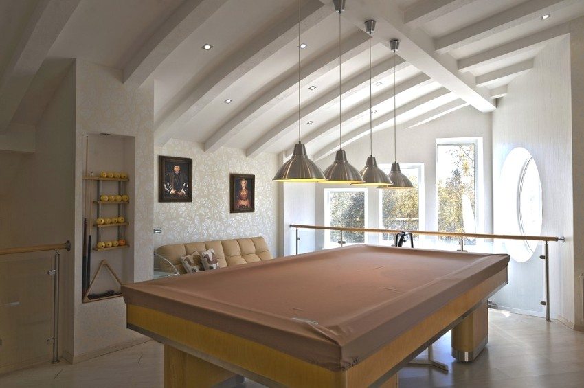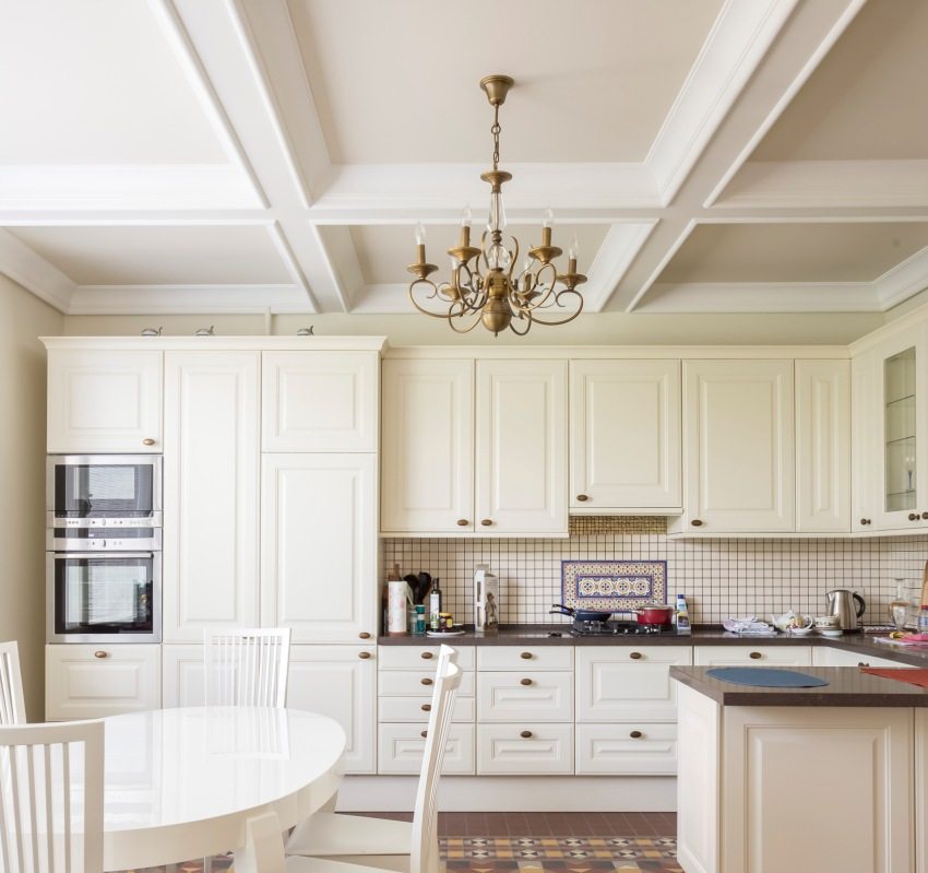 - cổ điển. Cung cấp trần phẳng với các đường thẳng, được trang trí bằng các đường viền polyurethane rộng. Đèn chùm đồ sộ được sử dụng làm đèn chiếu sáng chính;