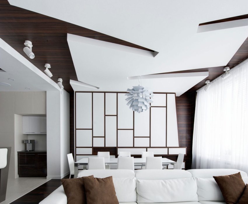 - hiện đại và phong cách hiện đại cung cấp các thiết kế táo bạo với hình dạng bất thường. Vì vật liệu trần mỏng, nó có thể được uốn cong trong một phạm vi rất rộng, cho phép bạn tạo ra các đối tượng thiết kế lạ thường nhất của trần thạch cao, những bức ảnh về chúng có thể được nhìn thấy thường xuyên nhất;