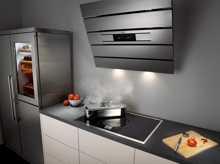 Việc chăm sóc máy hút mùi hàng ngày và giá cả của thiết bị phụ thuộc vào chất liệu sản xuất. Một chiếc máy hút mùi hiện đại cho nhà bếp, bức ảnh khẳng định rõ điều này, có thể được làm bằng nhôm, nhựa, inox hoặc thép tráng men và kính cường lực.