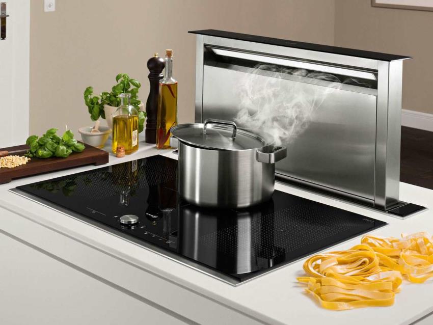Một kiểu máy hút mùi hiện đại rất được ưa chuộng từ năm 2016 là domino. Một thiết bị như vậy được lắp vào mặt bàn làm việc và trượt ra khỏi nó khi bếp điện hoặc gas đang hoạt động. Tuy nhiên, chi phí của một thiết kế hợp thời trang như vậy cao gấp 2 lần so với các phương án thay thế. Ngoài ra, loại thiết bị này có hiệu suất thấp nên phù hợp với những gian bếp nhỏ.