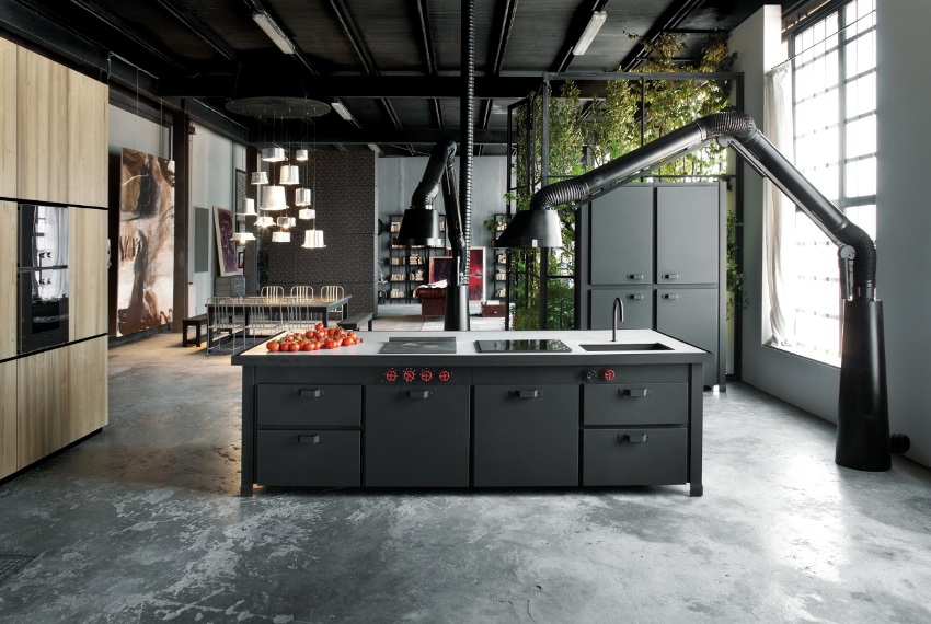 Lựa chọn lý tưởng cho phòng khách liền bếp là máy hút mùi âm trần đặt phía trên đảo bếp. Một thiết bị như vậy có kích thước ấn tượng và hiệu suất cao.