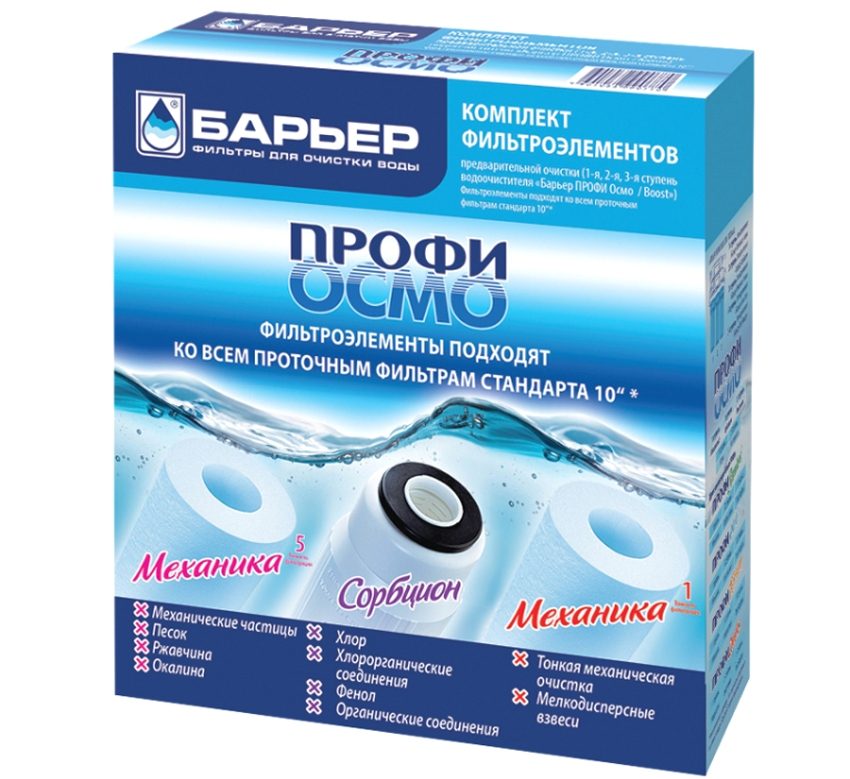 Cả bộ lọc thẩm thấu ngược và bộ lọc dòng tiêu chuẩn đều rời khỏi băng tải của chúng, hầu hết trong số chúng đều có ba mức độ lọc. Một tính năng của các mô hình của họ có thể được gọi là sự hiện diện của một lớp vỏ đặc biệt, cho phép đảm bảo không bị rò rỉ. Công suất lọc lên đến 2 lít nước / phút. Việc thay thế các hộp mực trong bộ lọc nước để rửa Barrier được thực hiện sơ cấp, trong vòng vài giây.